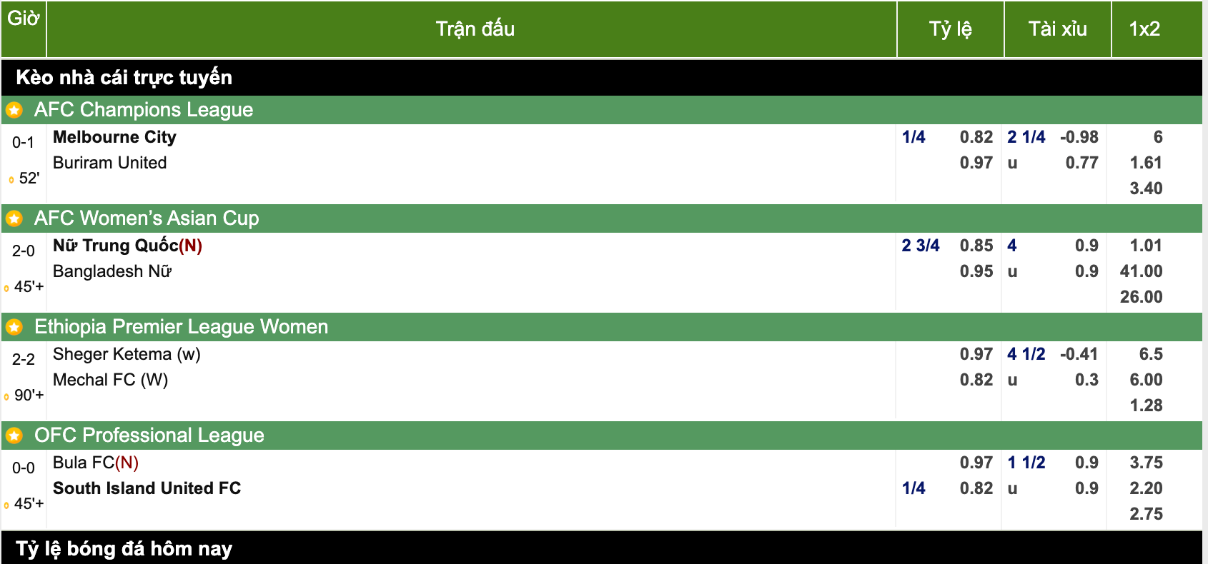 | H1 | 0 - 0 | Nữ Seoul Amazones - Nữ Gumi Sportstoto | 0.82 | 0:1/4 | 0.97 | ||||||